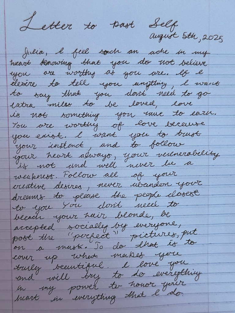 Julia, I feel such an ache in my heart knowing that you do not believe you are worthy as you are. If I desire to tell you anything, I want to say that you don’t need to go extra miles to be loved. Love is not something you have to earn. You are worthy of love because you exist. I want you to trust your instinct and to follow your heart always — your vulnerability is not and will never be a weakness. Follow all of your creative desires, never abandon your dreams to please the people closest to you. You don’t need to bleach your hair blonde, be accepted socially by everyone, post the “perfect” pictures, put on a mask. To do that is to cover up what makes you truly beautiful. I love you and will try to do everything in my power to honor your heart in everything that I do.